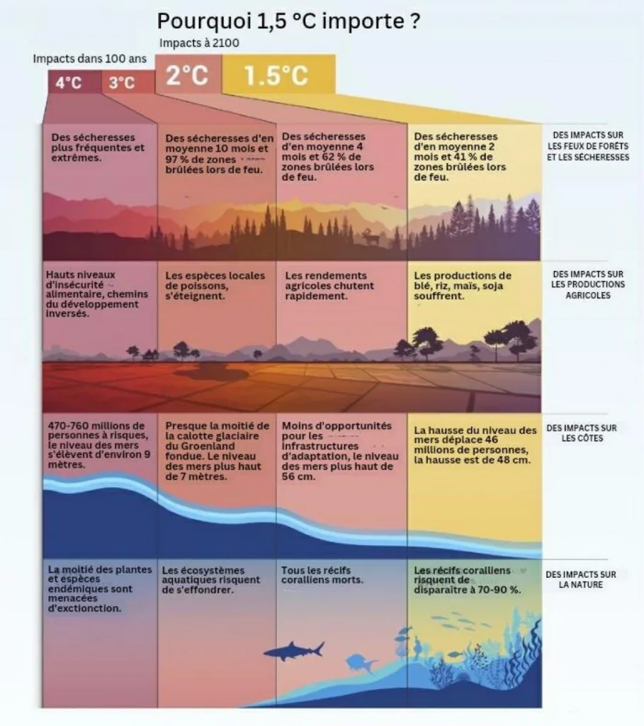 Pour les enseignantes et enseignants, l’infographie « Pourquoi 1,5°C importe ? » reprend les différents scénarios du GIEC et illustre de manière claire les impacts associés à chaque palier de changement climatique.