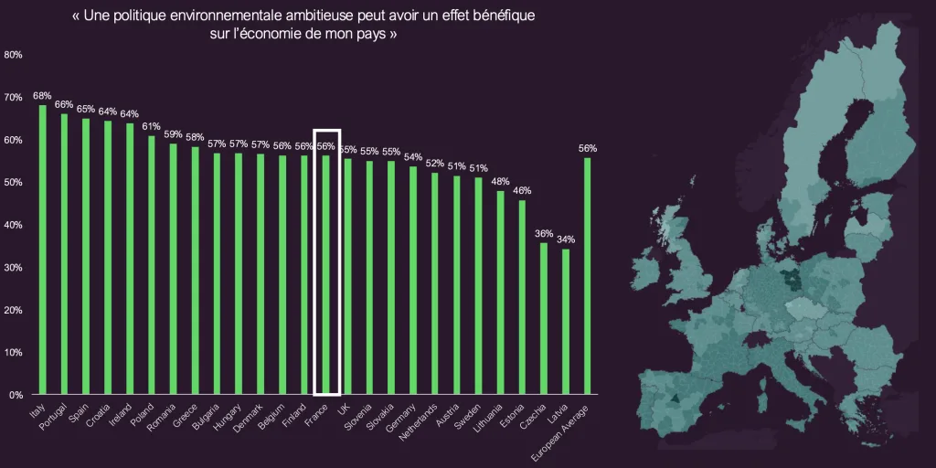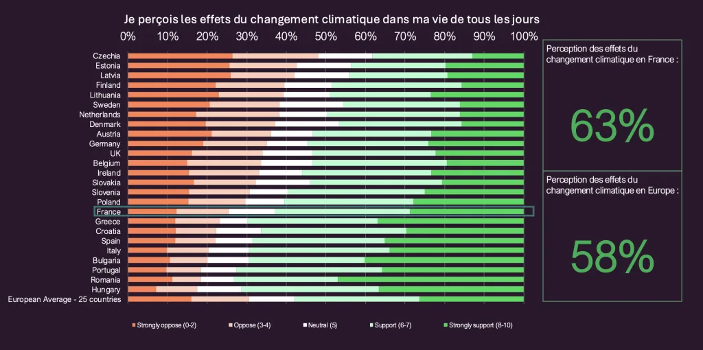Ainsi, parmi les enseignements de l’étude, l’idée d’un « backlash » écologique, si souvent invoquée, s’effrite. Les Européens continuent de juger le dérèglement climatique réel, grave, urgent même si leurs priorités immédiates se bousculent. 63% des Français déclarent déjà en ressentir les conséquences.