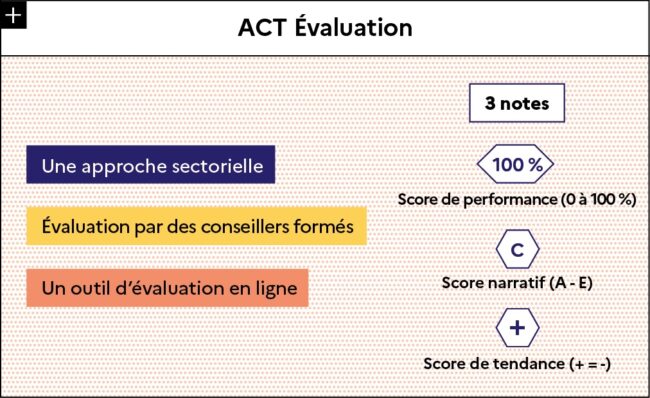 - Dans le cadre d’un plan de transition global, ACT Évaluation permet d’analyser et de mesurer la stratégie climatique de l’entreprise. Elle constitue également un gage de crédibilité, renforçant la confiance des parties prenantes dans les engagements climatiques de l’organisation.