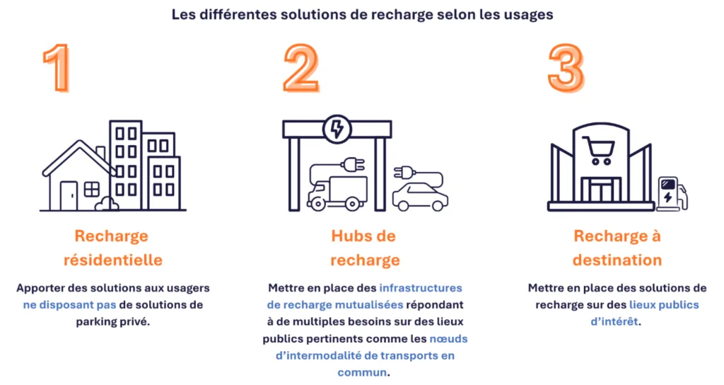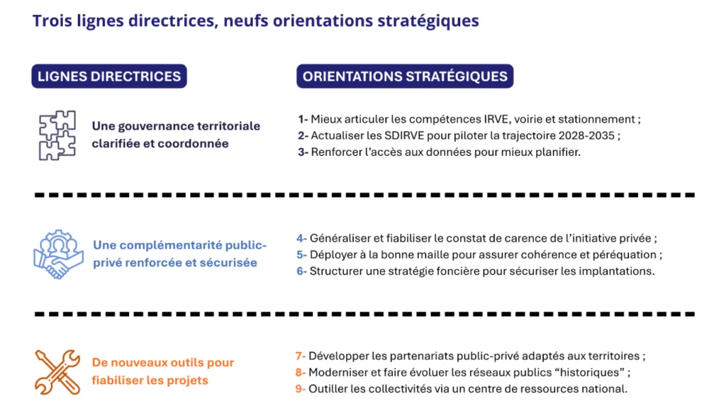 Trois axes stratégiques sont identifiés pour réussir la modernisation des réseaux IRVE existants et poursuivre le maillage du territoire :