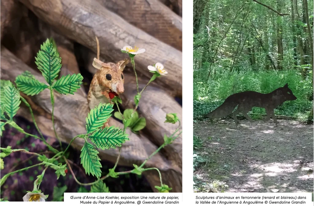 La dimension culturelle s’exprime également de manière emblématique à travers l’exposition « Nature de papier », présentée en 2024 au musée du Papier sur l’île de la Charente. L’artiste invitée y a proposé un univers poétique où animaux et paysages reconstitués dialoguent avec le patrimoine local. Accompagnée de films et de dispositifs de médiation, cette exposition a offert au public une expérience sensible, reliant création artistique et sensibilisation à la fragilité du vivant.