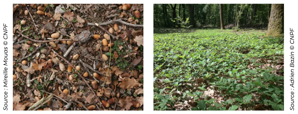 Glandée de chêne à gauche – Brosse de semis de chêne à droite