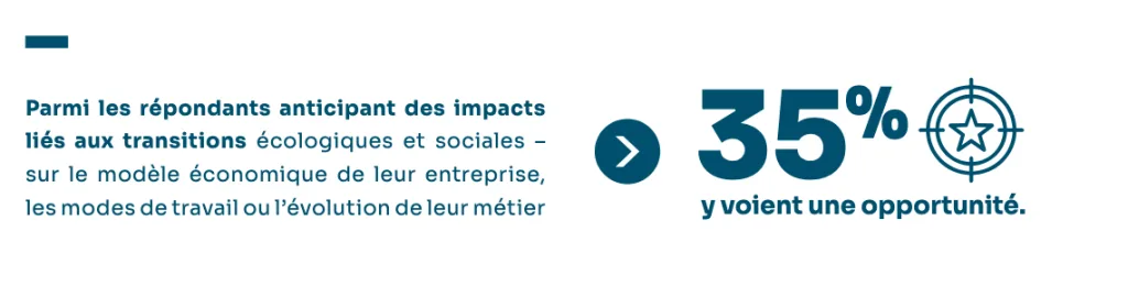 Pour une majorité d’actifs, la transition reste encore abstraite. Ainsi, 63 % estiment que l’intégration des enjeux écologiques et sociaux n’aura aucun impact ou seulement des effets mineurs sur leur entreprise dans les années à venir.  Près de 4 actifs sur 10 (39 %) ne savent pas si ces évolutions représentent une opportunité ou une contrainte, révélant une difficulté à se projeter dans ces transformations.