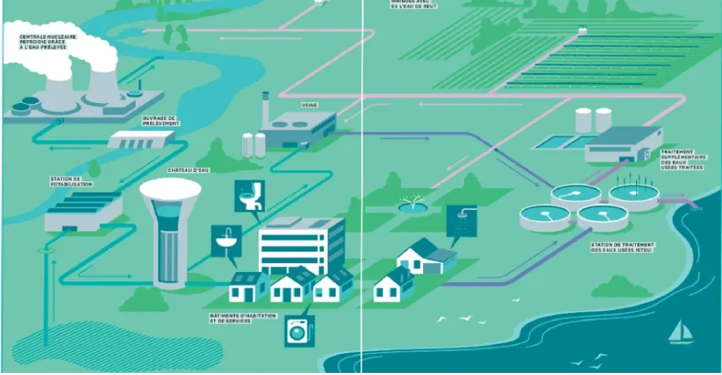 Du milieu naturel jusqu’à nos robinets, de la douche ou des toilettes vers les stations d’épuration, voici le chemin de l’eau de consommation humaine. Une autre voie est possible, celle de la REUT. Elle permet de réutiliser nos eaux usées avant de les rejeter dans le milieu naturel.