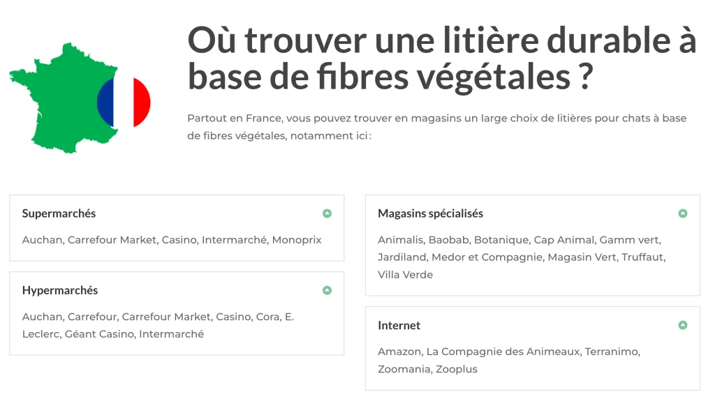 Partout en France, on peut trouver en magasins un large choix de litières pour chats à base de fibres végétales