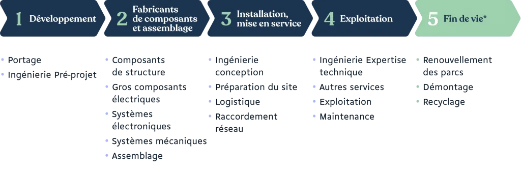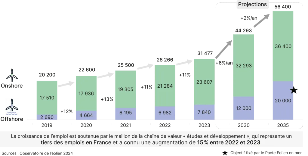 La filière éolienne est aujourd’hui l’un des premiers employeurs des énergies renouvelables en France, avec plus de 28 000 emplois directs et indirects recensés pour l’année 2022, en hausse de plus de 40% depuis 2019. Ces emplois couvrent l’ensemble de la chaîne de valeur d’un projet éolien : études environnementales et paysagères, génie civil, transport, installation, exploitation et maintenance, avec une forte présence dans les régions rurales où se situent les parcs.