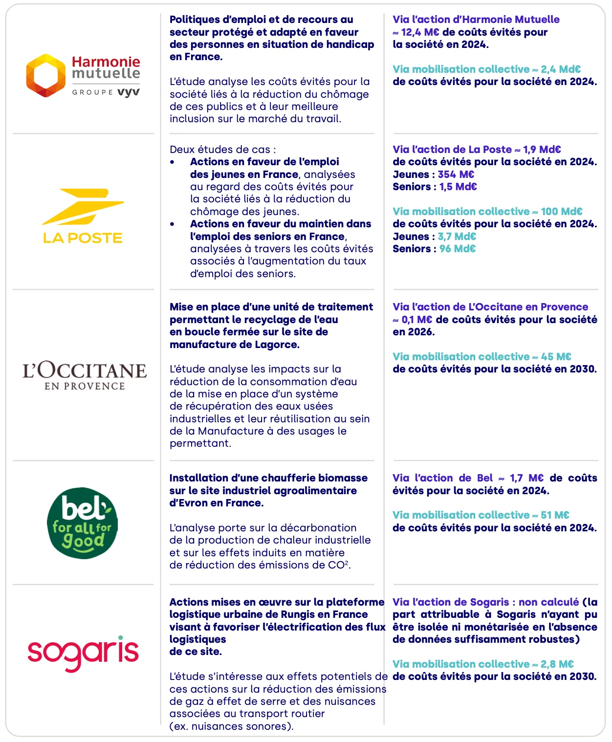 Pilotée par Impact France et Wavestone, l’étude repose sur l’analyse approfondie de sept actions mises en œuvre par six entreprises (Veolia, Bel, Sogaris, L’Occitane en Provence, La Poste et Harmonie Mutuelle), couvrant des enjeux environnementaux (réduction des émissions de gaz à effet de serre, transition énergétique, préservation de la ressource en eau) et des enjeux sociaux (emploi et inclusion sur le marché du travail). Elles portent sur des périmètres variés, allant du site industriel ou logistique à l’échelle nationale ou internationale.