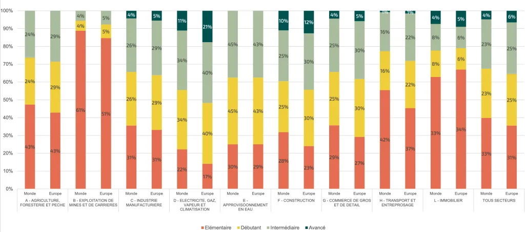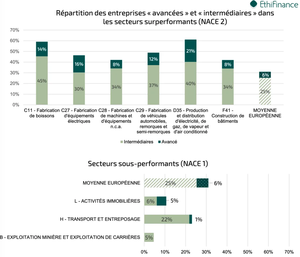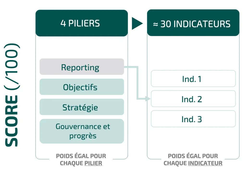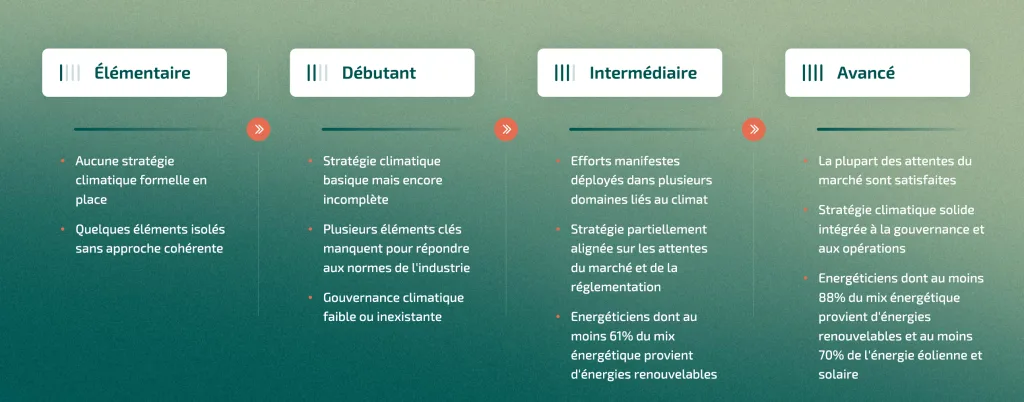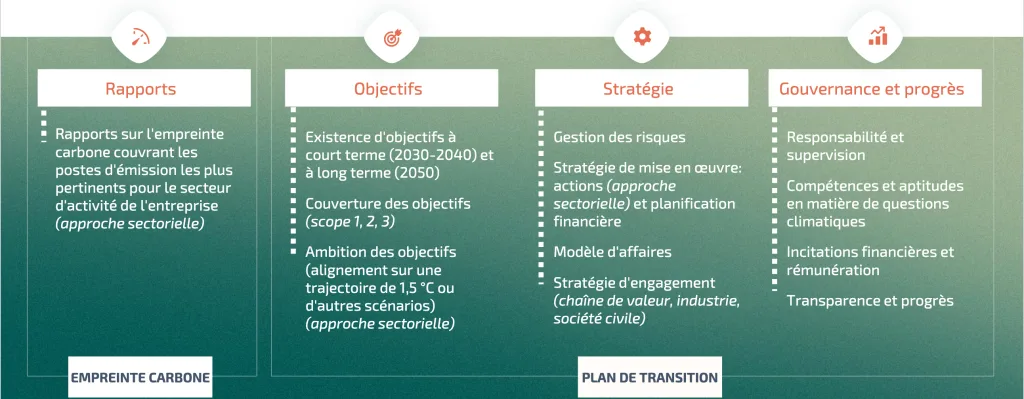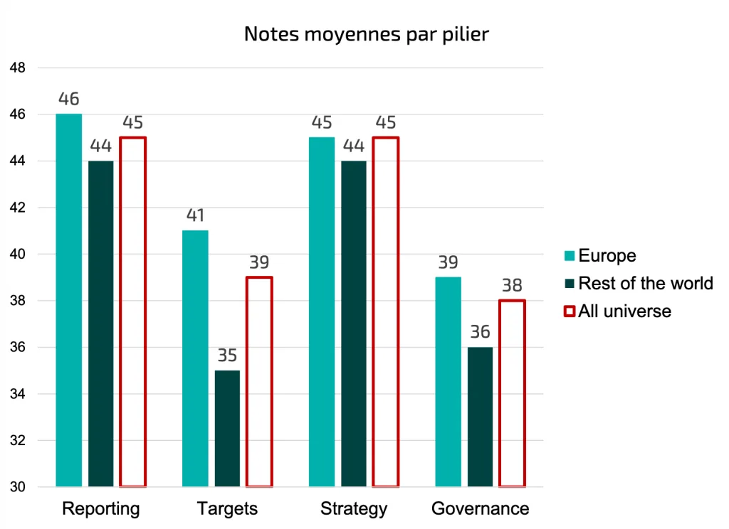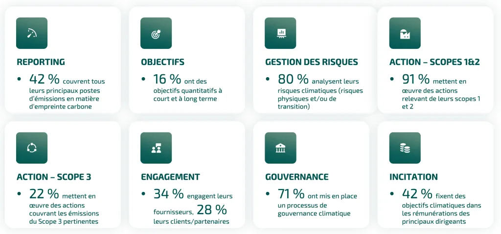 La plupart des entreprises manquent d’une gouvernance solide et d’objectifs clairs en matière de transition climatique. Le reporting et la stratégies (actions mises en œuvre) montrent des progrès légèrement meilleurs, mais restent limités.