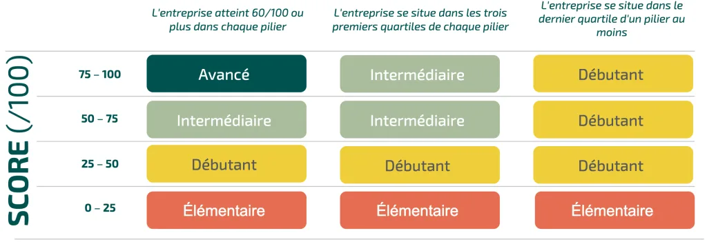 Pour les PME (< 500 employés), l’échelle de notation est moins exigeante pour certains indicateurs (par exemple, les objectifs à long terme) et certaines autres questions sont notées comme des « bonus », ce qui signifie que les PME ne peuvent pas perdre de points sur ces questions.