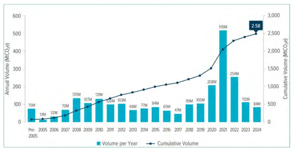 Volumes de crédits commercialisés sur le marché du carbone volontaire. Période pré-2005 à 2024 (source : Ecosystem Marketplace 2025)
