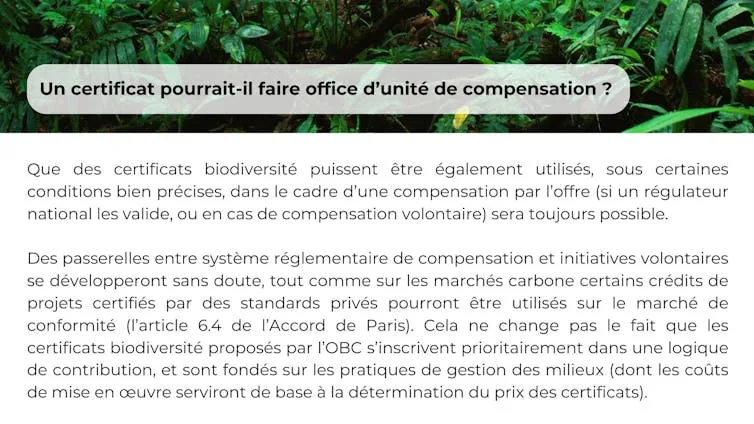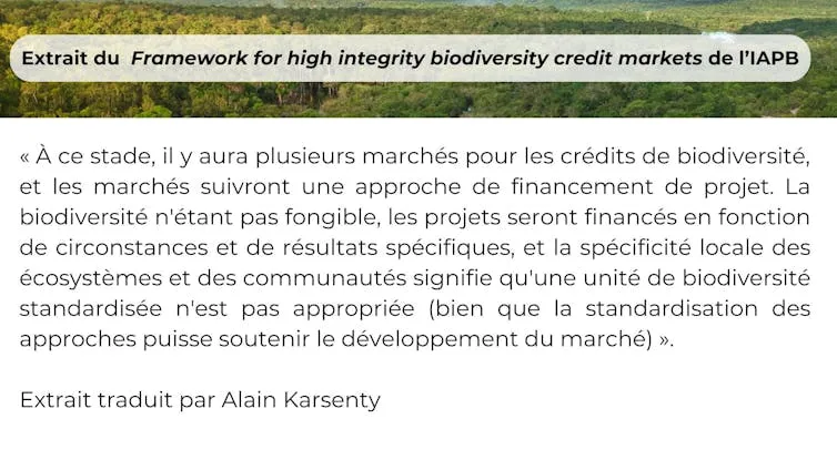 Au bout du compte, ce document de l’IAPB semble proposer au public une approche des crédits biodiversité volontaires assez similaire à ce qui existe déjà dans le cadre de la « compensation par l’offre », système existant dans plusieurs pays, et que la France a introduit officiellement en 2023 avec les SNCRR). Aux États-Unis, depuis les années 1980, des « mitigation banks », initient des actions de conservation ou de restauration d’habitats pour générer, bien avant que ne se produisent les dommages liés aux réalisations d’infrastructures, des crédits biodiversité spécifiques à différents types de milieux naturels (et donc non fongibles). Ces opérateurs, publics ou privés, les vendent ensuite aux entreprises qui doivent compenser leurs impacts. Les équivalences écologiques sont, tant du côté de l’offre de crédits que des obligations d’achat, étroitement supervisées par des consultants accrédités par les autorités environnementales. Le principal élément nouveau des crédits biodiversité évoqués par l’IAPB est qu’ils pourront servir également d’instruments de contribution.