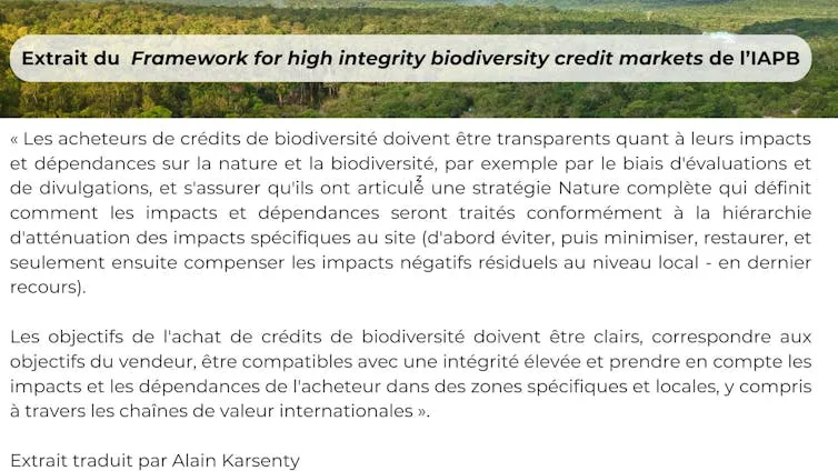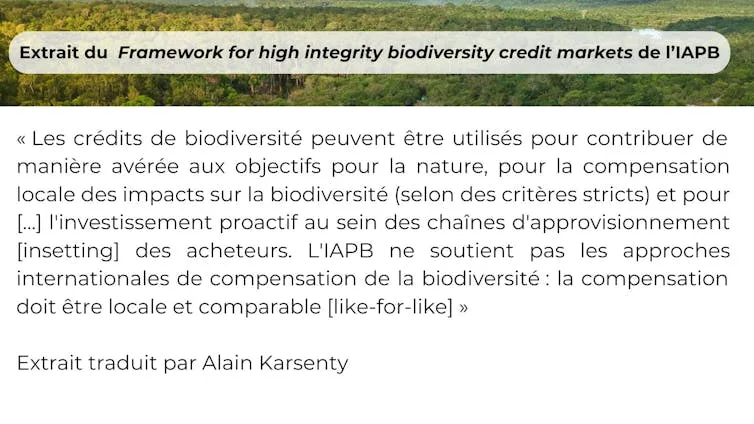 Cependant, en parlant également « d’investissement proactif au sein des chaînes d’approvisionnement », l’approche promue par l’IAPB dépasse la seule compensation locale, puisque sont également envisagées des contributions à l’effort collectif pour la biodiversité au sein ou en dehors de la chaîne de valeur de l’entreprise acquérant des crédits biodiversité (dépassant ainsi le cadre local de la compensation). C’est une dimension nouvelle, et cela entraîne des questions sur l’emploi du mot crédit, lequel renvoie directement à l’idée de compensation (puisqu’un crédit suppose un débit).