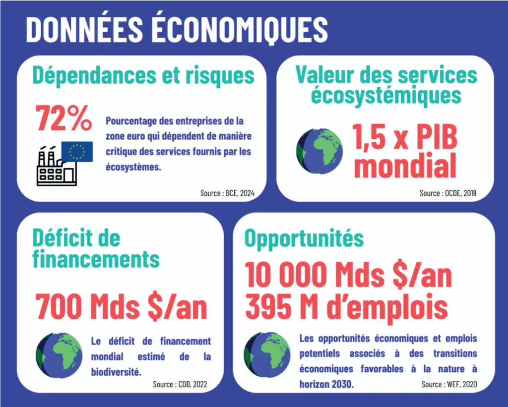 72 % des entreprises de la zone euro dépendent directement des services rendus par les écosystèmes selon la Banque centrale européenne.