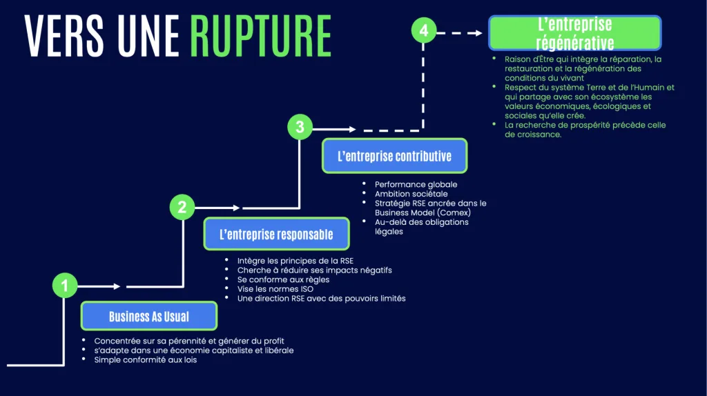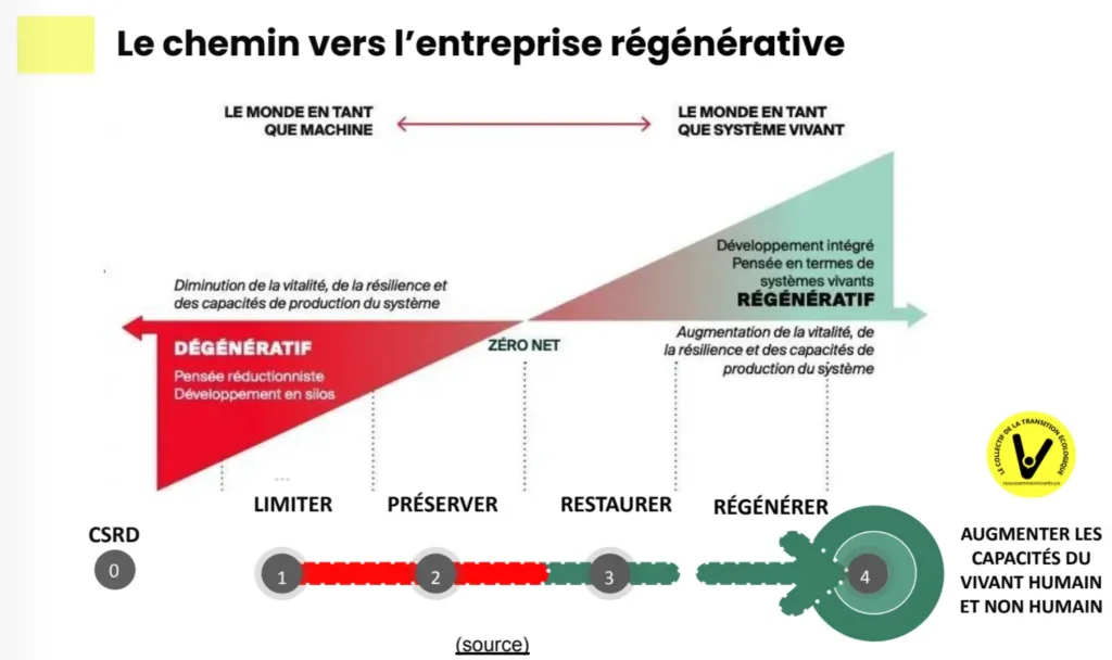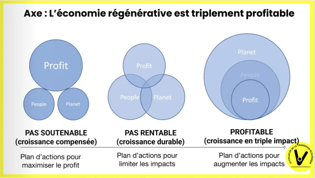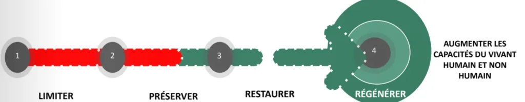 La régénération est un chemin. La régénération c’est la capacité du vivant à atteindre sa pleine capacité dans son milieu de vie. Après une phase de conformité et de réduction des impacts négatifs les entreprises sont en croissance en triple impacts : économique, environnementale et sociale. Elle contribuent de part leur activité à la prospérité des territoires.