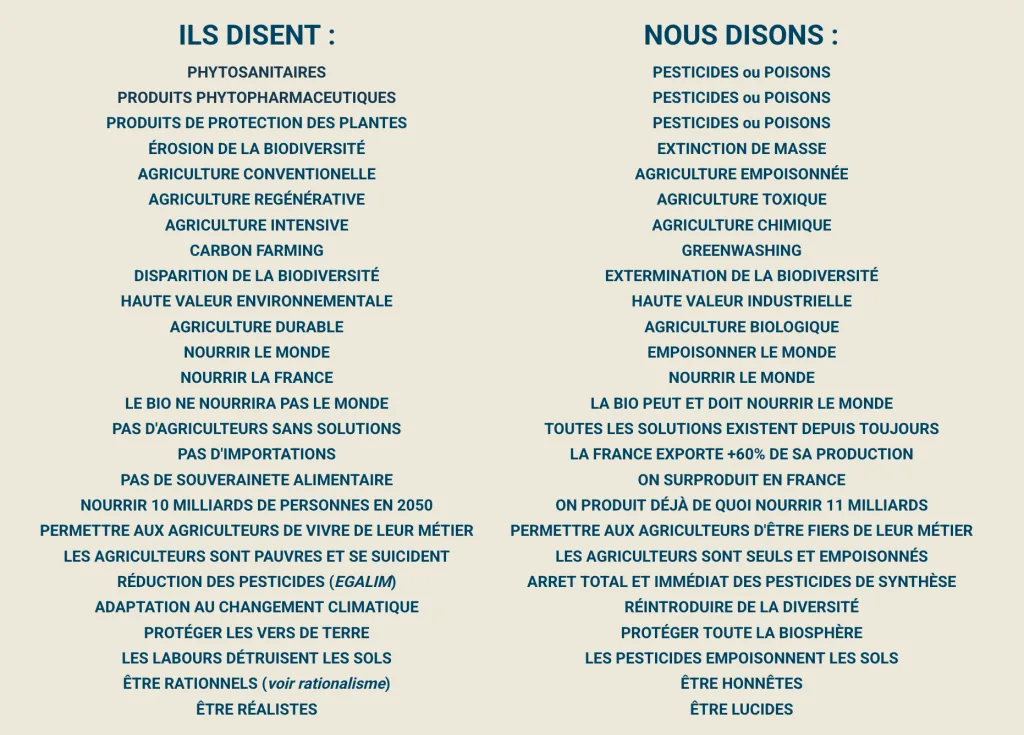 - DEFLECT – Détourner le problème : « Le problème c’est les labours, les espèces invasives, le réchauffement climatique, les agriculteurs qui utilisent mal les produits, les chats, les écrans, les médicaments, les microplastiques, l’artificialisation, les poêles Tefal, les pneus, les vaccins, … ». Bref, ça n’est pas les pesticides le problème et si ça l’est, c’est de manière marginale. C’est« multifactoriel ».