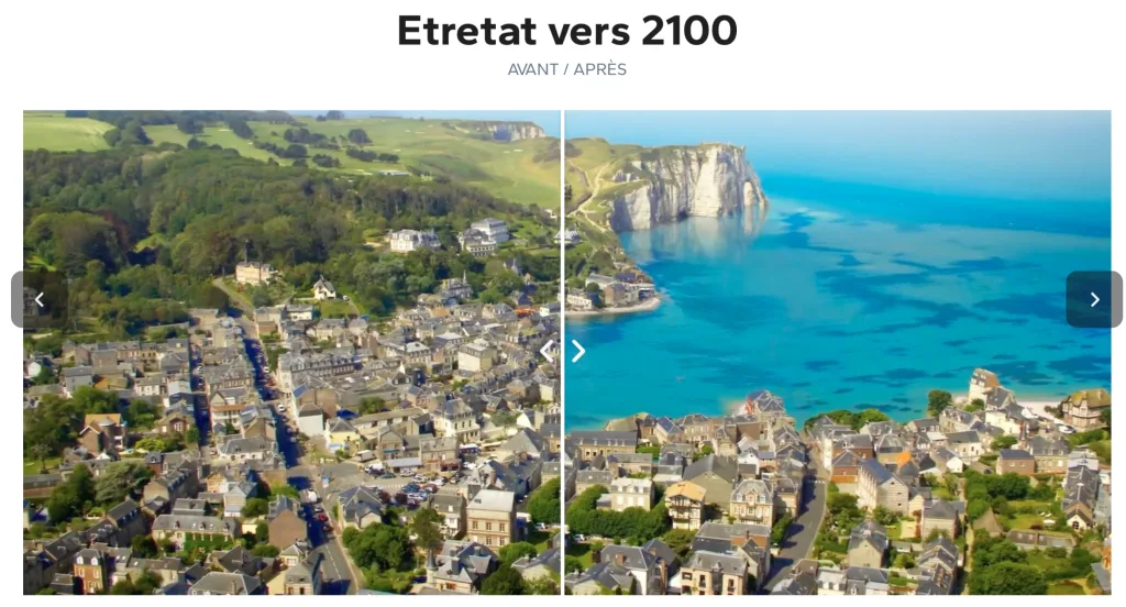 C’est l’histoire d’un voyage en France en 2100 qui commencerait sur les côtes de la Normandie. Cette région, exposée à la montée des eaux, nous mènera à choisir entre élever des digues toujours plus hautes ou au contraire nous adapter à un nouveau tracé côtier. Plus au nord, dans le marais Audomarois, entre Saint-Omer et Dunkerque, la montée des eaux pourrait même redessiner un tout autre Pas-de-Calais et l’on y vivrait une expérience différente mais plaisante entre terre et mer.