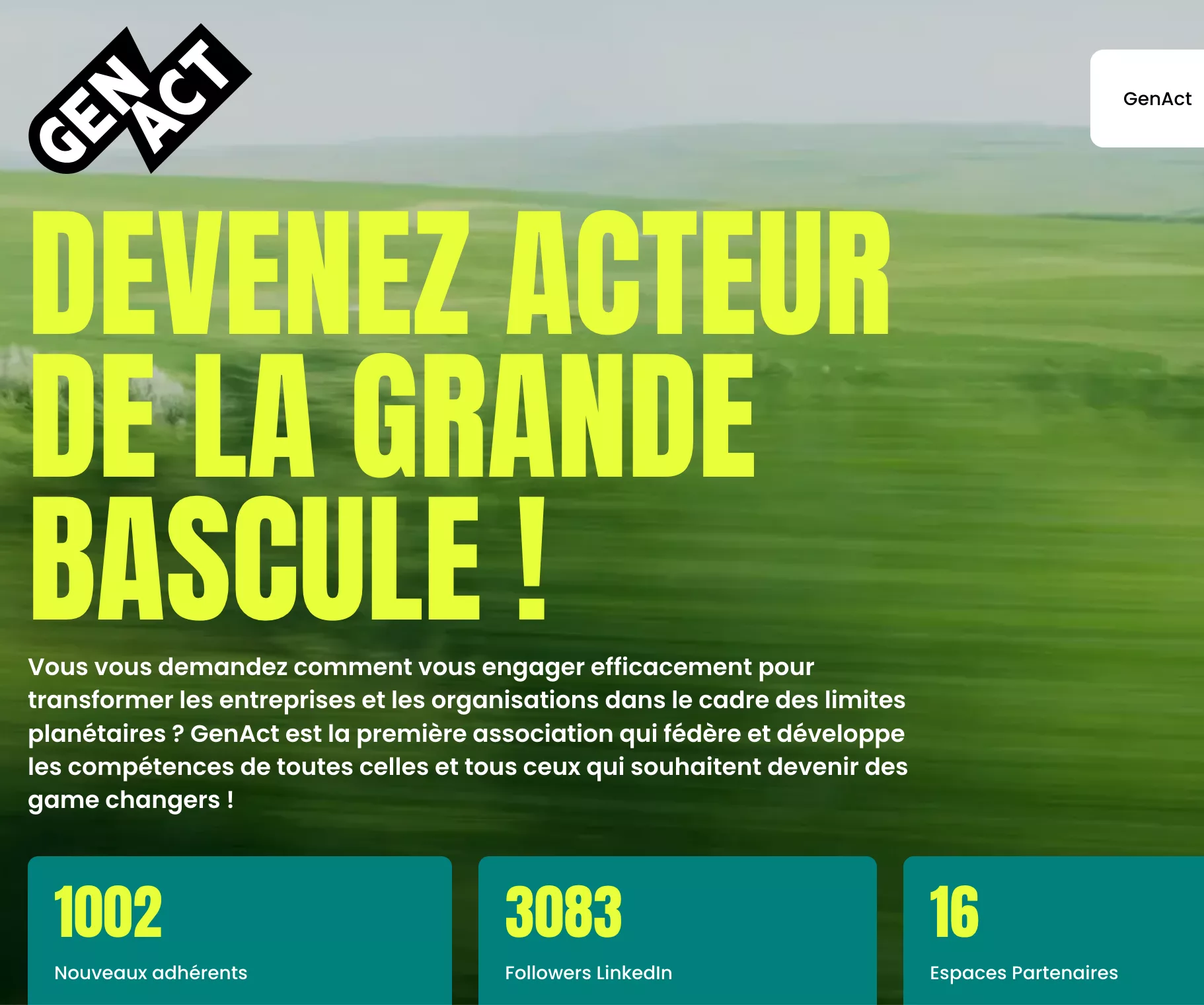 L’objectif de l’association GenAct est de permettre à tous les salariés et citoyens du monde de s’engager concrètement pour la transformation des modèles économiques des entreprises, afin de les rendre plus respectueux des limites planétaires et des droits humains fondamentaux. Pour opérer cette bascule, GenAct propose les Dix commandements de l’entreprise régénérative, pour passer de la réduction des impacts négatifs à la création d’impacts positifs nets. Agir pour protéger le vivant et les conditions d’habitabilité de la planète.