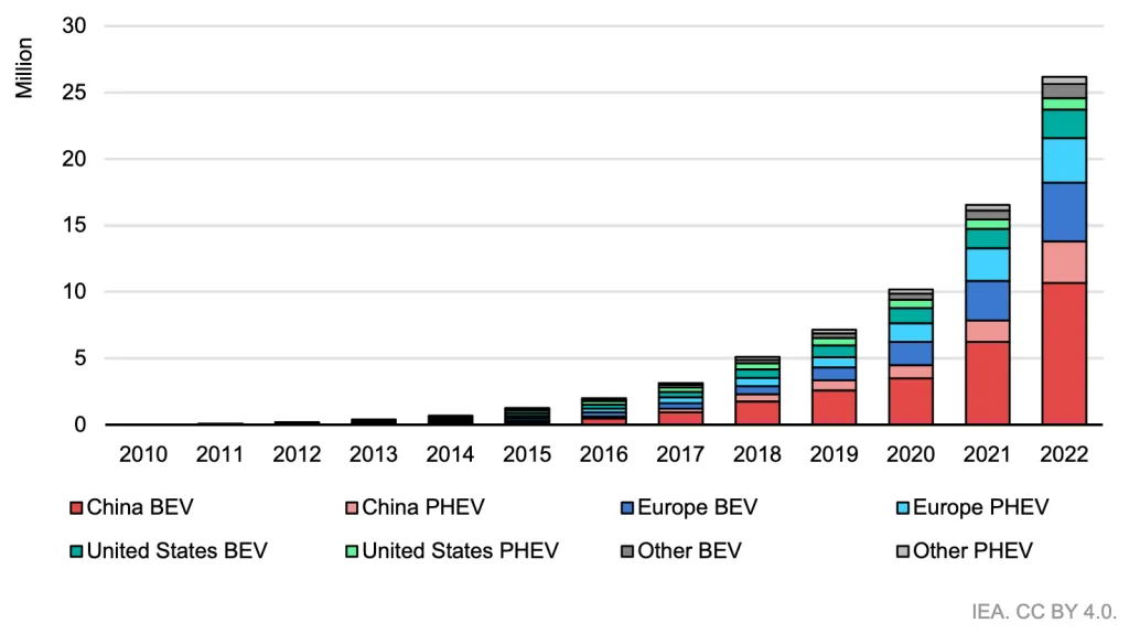 Remarques : VEB = véhicule électrique à batterie ; VPH = véhicule hybride rechargeable. Le parc de véhicules électriques présenté dans ce graphique concerne les véhicules légers de tourisme. En « Europe », les pays de l’Union européenne, la Norvège et le Royaume-Uni représentent plus de 95 % du parc de véhicules électriques en 2022 ; ce total inclut également l’Islande, Israël, la Suisse et la Turquie. Les principaux marchés de la catégorie « Autres » comprennent l’Australie, le Brésil, le Canada, le Chili, le Mexique, l’Inde, l’Indonésie, le Japon, la Malaisie, la Nouvelle-Zélande, l’Afrique du Sud, la Corée et la Thaïlande. Les données statistiques relatives à Israël sont fournies par les autorités israéliennes compétentes et relèvent de leur responsabilité. L’utilisation de ces données par l’OCDE est sans préjudice du statut du Golan, de Jérusalem-Est et des colonies israéliennes en Cisjordanie au regard du droit international. Source : Analyse de l’AIE basée sur les données communiquées par les pays, ACEA, EAFO, EV Volumes et Marklines.