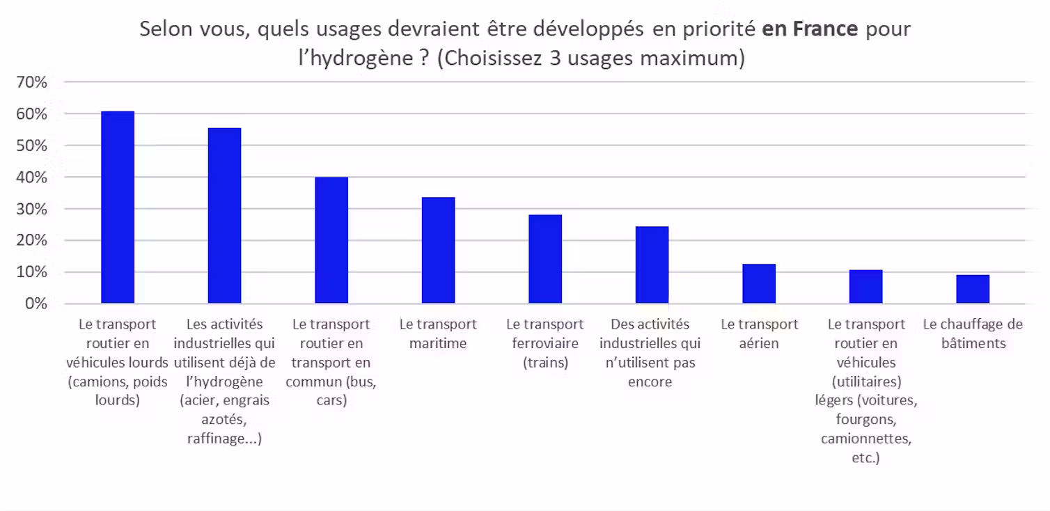 144 experts (industriels, du conseil, administration ou académie) de l’énergie (20 % de spécialistes en efficacité énergétique ; 25 % en multi-énergie ; 12 % en hydrogène ; 16 % en ENR ; 8 % en mobilité ; 5 % en nucléaire ; 3 % en énergies fossiles ; 11 % autre) ont participé à au baromètre de l’énergie sur l’avenir de la filière hydrogène en France. Baromètre du marché de l’énergie — GEM, CC BY-NC-ND