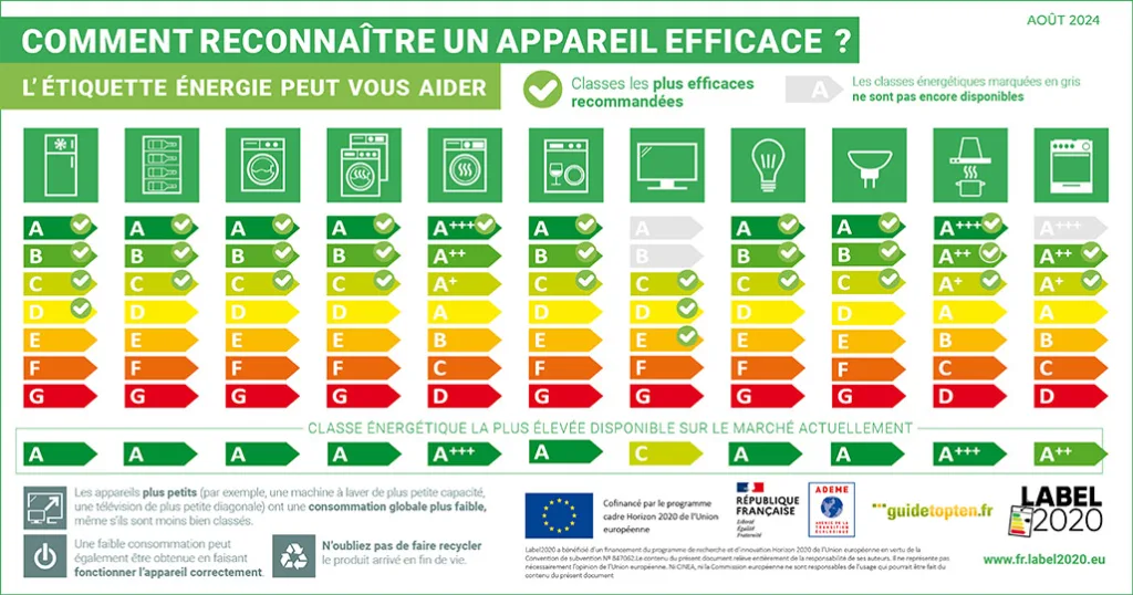 Dans l’électroménager, l’étiquette énergie demeure l’outil principal avec sa classification de A à G simplifiée depuis 2021. Cette notation privilégie la consommation électrique annuelle et intègre des critères comme le niveau sonore ou la capacité de lavage.