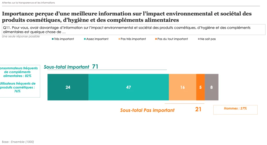 - 71 % des Français déclarent vouloir plus d’informations sur l’impact des produits cosmétiques, d’hygiène et compléments alimentaires.