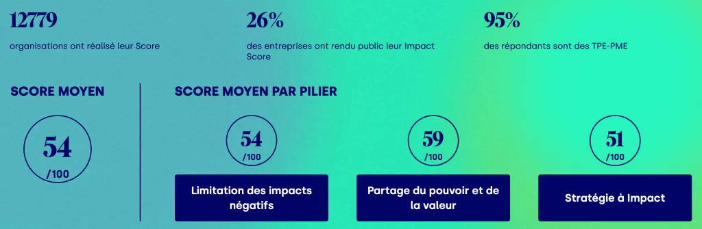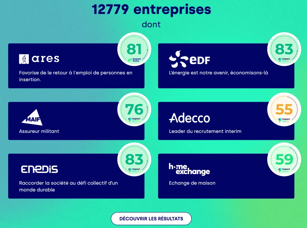 Face aux nouvelles réglementations et à la multiplication des labels, l’Impact Score est le référentiel commun construit par et pour les entrepreneurs et dirigeants. Il permet à toute entreprise de s’évaluer, en 2h, sur son impact social et écologique à 360° et de rendre visible son niveau de progression.