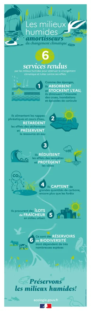 Protection contre les inondations, les sécheresses, les tempêtes ; sources de nourriture, d’eau potable ; lieux de loisirs, de détente, de contemplation… les services rendus chaque jour par les zones humides sont nombreux et indispensables. Elles sont véritablement notre assurance-vie dès aujourd’hui et pour demain.