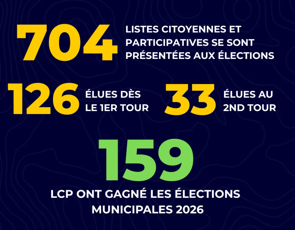 L’issue du second tour des élections municipales 2026 marque une étape de consolidation pour les listes citoyennes et participatives (LCP). Avec 159 listes citoyennes et participatives élues en France (contre 66 en 2020, soit plus de deux fois plus), ces démarches confirment leur capacité à s’installer durablement dans le paysage politique français.