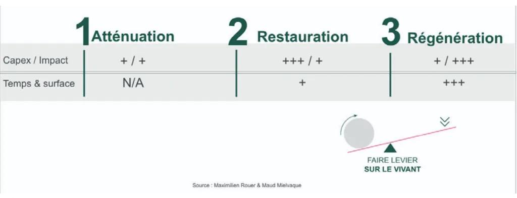 - 1️⃣ La régénération de la nature est non seulement une réponse majeure aux impacts environnementaux (par la régénération des cycles de l’eau et des microclimats locaux, captation du carbone, augmentation de la biodiversité, dépollution de l’eau, de l’air et des sols), et c’est aussi une réponse efficace et efficiente aux nouveaux risques environnementaux qui touchent les entreprises (au niveau des ressources, de la chaîne logistique et des usines).