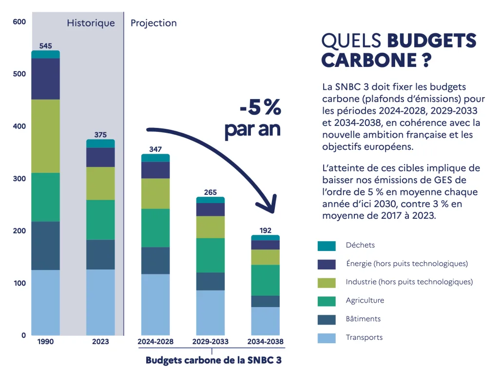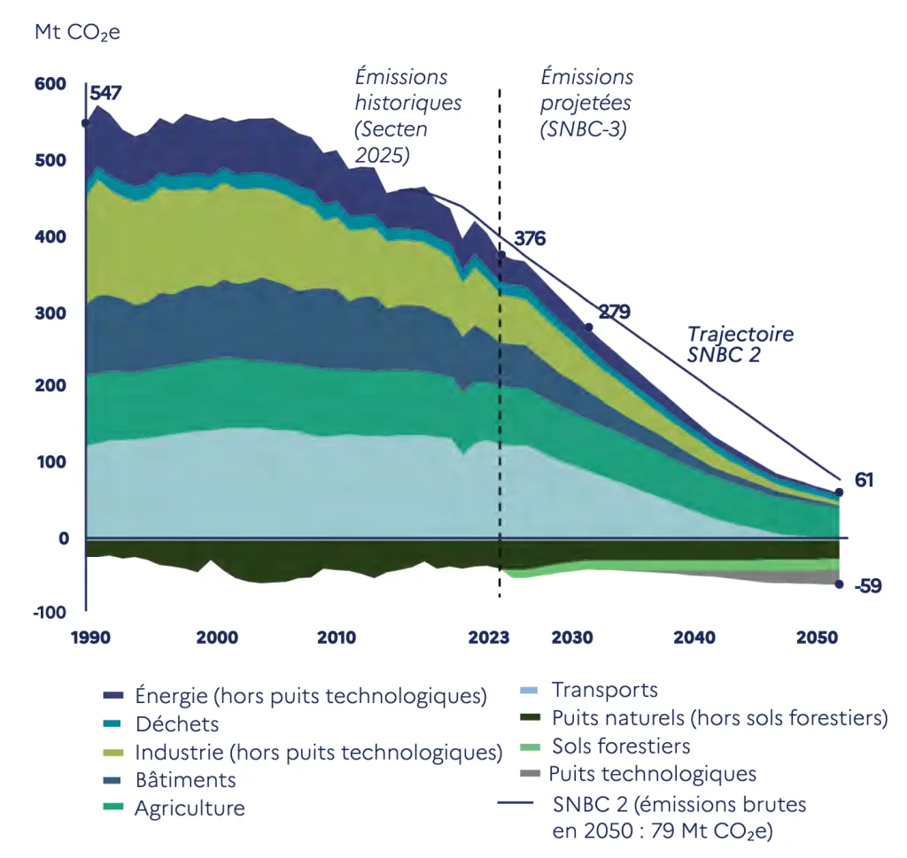 Ce document fixe la trajectoire de réduction des émissions de gaz à effet de serre jusqu’en 2050 et constitue le cadre stratégique pour atteindre la neutralité carbone, conformément aux engagements internationaux de la France. Il est cohérent avec la trajectoire européenne 2040 adoptée récemment au Conseil de l’Union Européenne.