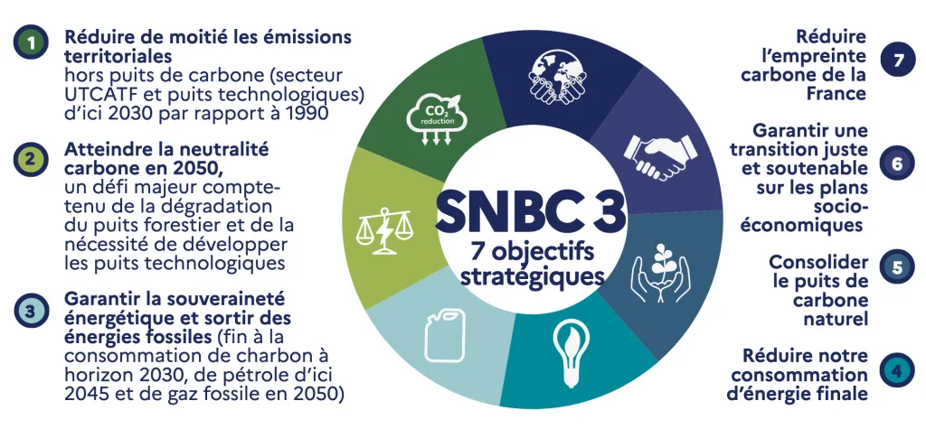 La SNBC 3 s’articule autour de huit grands objectifs qui structurent la trajectoire nationale vers la neutralité carbone :