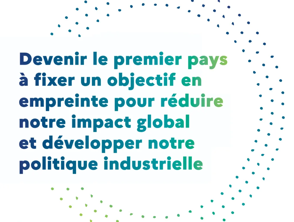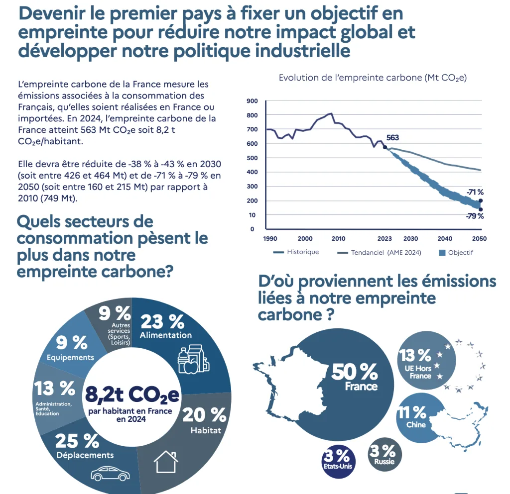 - Diminuer l’empreinte carbone globale de la France, en intégrant pour la première fois les émissions importées, selon un principe de préférence européen.