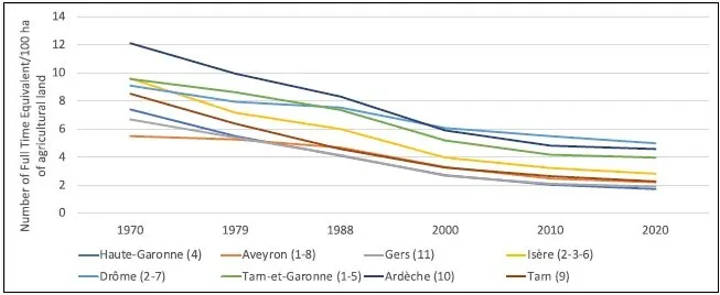Conformément à ce nouveau modèle économique de productivité et de croissance rapides, l’agriculture était elle aussi censée améliorer constamment sa productivité, notamment par la mécanisation des travaux agricoles. La recherche de rendements accrus et d’une rentabilité à court terme a conduit les agriculteurs à se spécialiser dans un ou quelques types de production. Dans le massif limousin, par exemple, l’élevage bovin s’est rapidement développé dans les années 1980 car il était moins exigeant en main-d’œuvre que l’élevage ovin. La spécialisation dans l’élevage bovin a permis de simplifier les méthodes agricoles et d’agrandir les exploitations, laissant de nombreuses tourbières en friche. De plus, l’élevage bovin étant moins exigeant en main-d’œuvre et plus productif, et les exploitations s’agrandissant sans cesse, le nombre d’emplois agricoles a diminué : aujourd’hui en France, il ne reste que 8 % du nombre d’agriculteurs de 1950. Ce phénomène est aujourd’hui reconnu comme l‘une des principales causes du déclin rural, tant sur le plan de la vie sociale que sur celui des opportunités d’emploi :