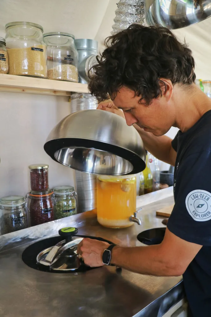 Pendant quatre mois, avec Caroline Pultz, il réinvente tout : isolation, cuisson, gestion de l’eau, toilettes, lessive, alimentation… Le lave-linge est actionné par un rameur, les toilettes deviennent un petit écosystème de larves et de plantes dépolluantes, la douche sert de champignonnière à pleurotes, et les déchets sont valorisés sur place avec un broyeur.