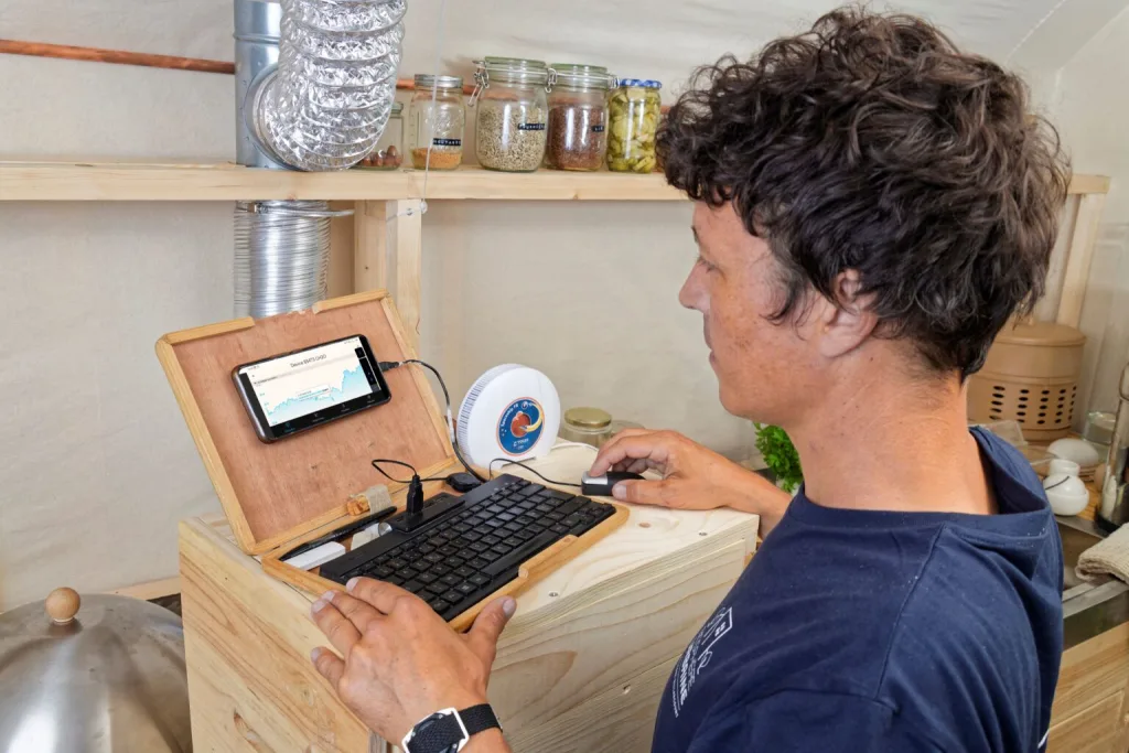 Dans leur cuisine de moins de 3 m², la cocotte isolée leur a permis de préparer des repas plus sains, grâce à une cuisson lente à l’eau, tout en limitant leur consommation d’énergie. L’appareil fonctionne sur un réseau en 12 volts, comme ceux que l’on trouve à bord des bateaux. Des capteurs placés sous l’installation contrôlent la température et ajustent l’énergie consommée, via un algorithme connecté à la batterie. Pendant ces quatre mois d’expérimentation, les restes alimentaires des deux colocataires ont servi à nourrir des grillons qui constituaient leur unique source de protéines animales dans un régime presque entièrement végétarien.