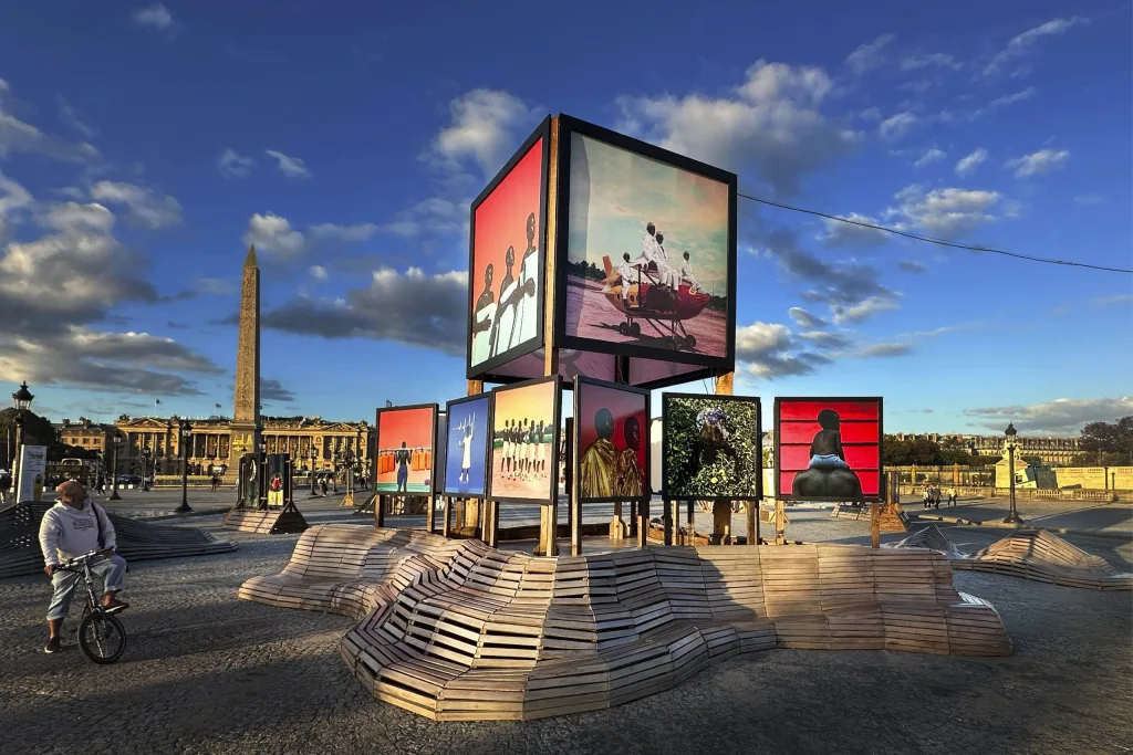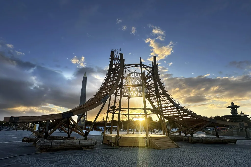 Au centre du dispositif, la Tour Concordia, installation monumentale de l’architecte Arthur Mamou-Mani, est habillée pour l’occasion de drapeaux de la Terre. Elle est l’espace de dialogue et de rencontre qui portera aussi le message de coopération plus haut et plus fort. En arrière-plan, l’obélisque, l’Assemblée Nationale, les Champs Élysées et la Tour Eiffel.