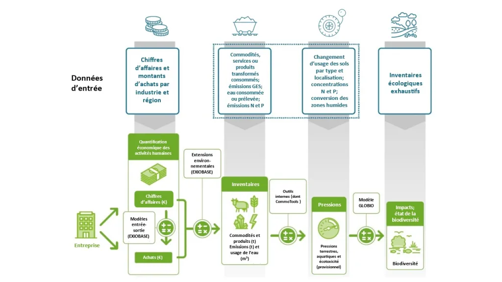 - Établir le lien entre activités économiques et pressions sur la biodiversité en chiffrant la contribution de l’activité économique à ces pressions ;