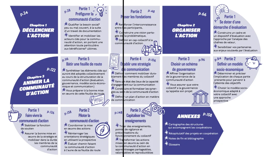 Dotée de solides fondations (voir chapitre 1 — Déclencher), la communauté d’action s’est structurée en choisissant collectivement une démarche d’évaluation, un modèle socio-économique, un schéma de gouvernance et une stratégie de communication17 (voir chapitre 2 — Organiser).
