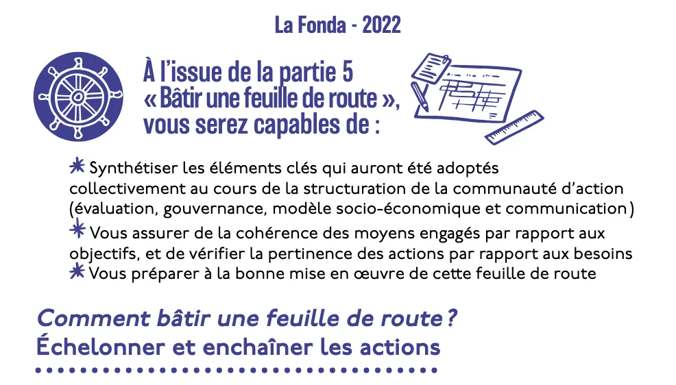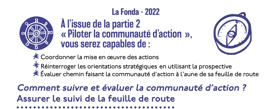 L’ensemble de ces éléments est synthétisé dans une feuille de route, véritable boussole de la communauté d’action. Les communautés d’action sont néanmoins des organisations apprenantes : c’est chemin faisant que les modalités de fonctionnement idéales seront stabilisées, au gré des avancées, des nouvelles arrivées dans le collectif, des essais… Le rôle de la fonction de soutien est maintenant (voir préambule)