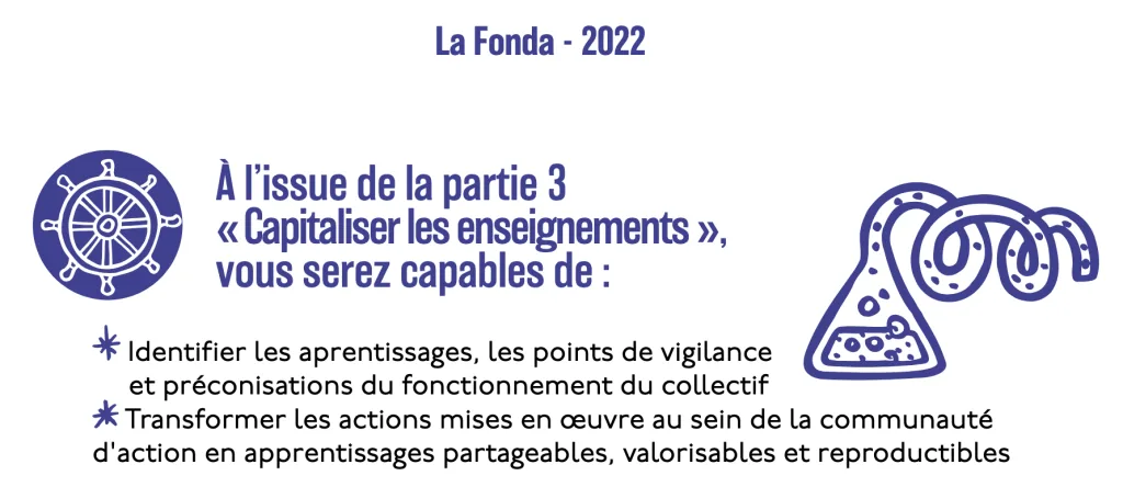 - — De capitaliser les enseignements. En transformant ses actions en apprentissages reproductibles, la capitalisation s’avère stratégique pour la communauté d’action. Capitaliser ses enseignements lui permet de grandir, mais aussi d’enclencher des changements culturels systémiques.