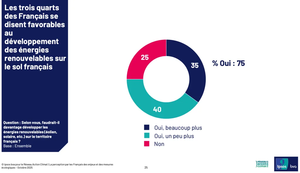 - 89 % sont favorables aux panneaux solaires sur bâti existant et 75 % pour le développement des énergies renouvelables (éolien et solaire)