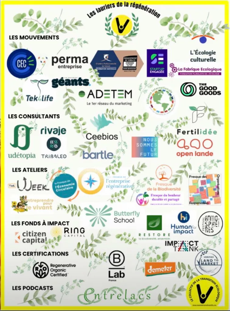 Les mouvements engagés : Convention de Entreprises pour le Climat (CEC – Guillaume Bizet), Permaentreprise (Michèle BUINET), Association des professionnels du marketing (ADETEM – Claudie VOLAND RIVET) , La Fédération des Chambres Professionnelles du Conseil (FNCPC – Laurent MELLAH), Tek4life (Florent Courau), StartUp Engagée (Aurelie Sykes Darmon), l’Ecologie Culturelle (Patrick Scheyder). Alliance Internationale pour les Objectifs de Développement Durable (Pascale Fressoz). Les consultants engagés : Rivaje (Thibaut Gabrillargues), Fertilidée (Mathieu Maréchal), Udetopia (Astrid du Petit Thouars) … Les ateliers : The week (Guillaume Dietenhoeffer), Fresque des organisations responsables (Morgane Jacquet), Fresque de l’économie circulaire (Elsa Bortuzzo), …Les fonds d’investissement engagés : Citizen Capital (Jonathan Piquet), Human for impact (Stéphanie Rognon)… Avec le soutien de : Regenerative Organic Certified, Land to market, Demeter. Et les podcasts Entrelacs (Gaelle Brunetaud) …