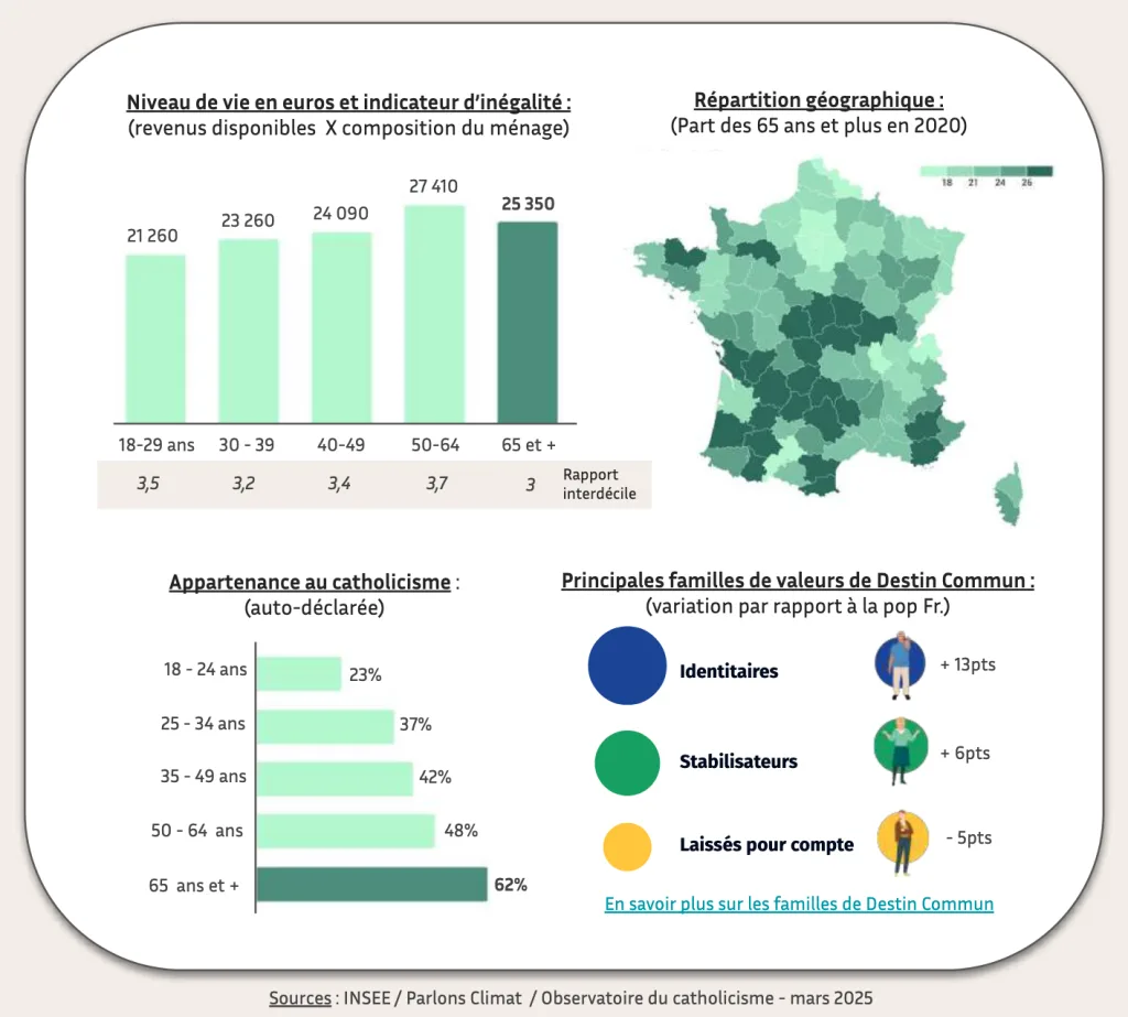 - Une forte empreinte du catholicisme avec des valeurs et une éducation religieuse qui leur ont été transmises par leurs parents. Aujourd’hui, 6 seniors sur 10 se disent catholiques.