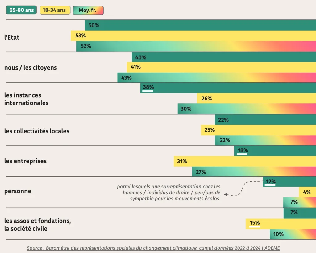 On note une part plus importante (12%) de seniors déclarant que “personne” n’est efficace pour résoudre le changement climatique, contre 4% chez les moins de 35 ans
