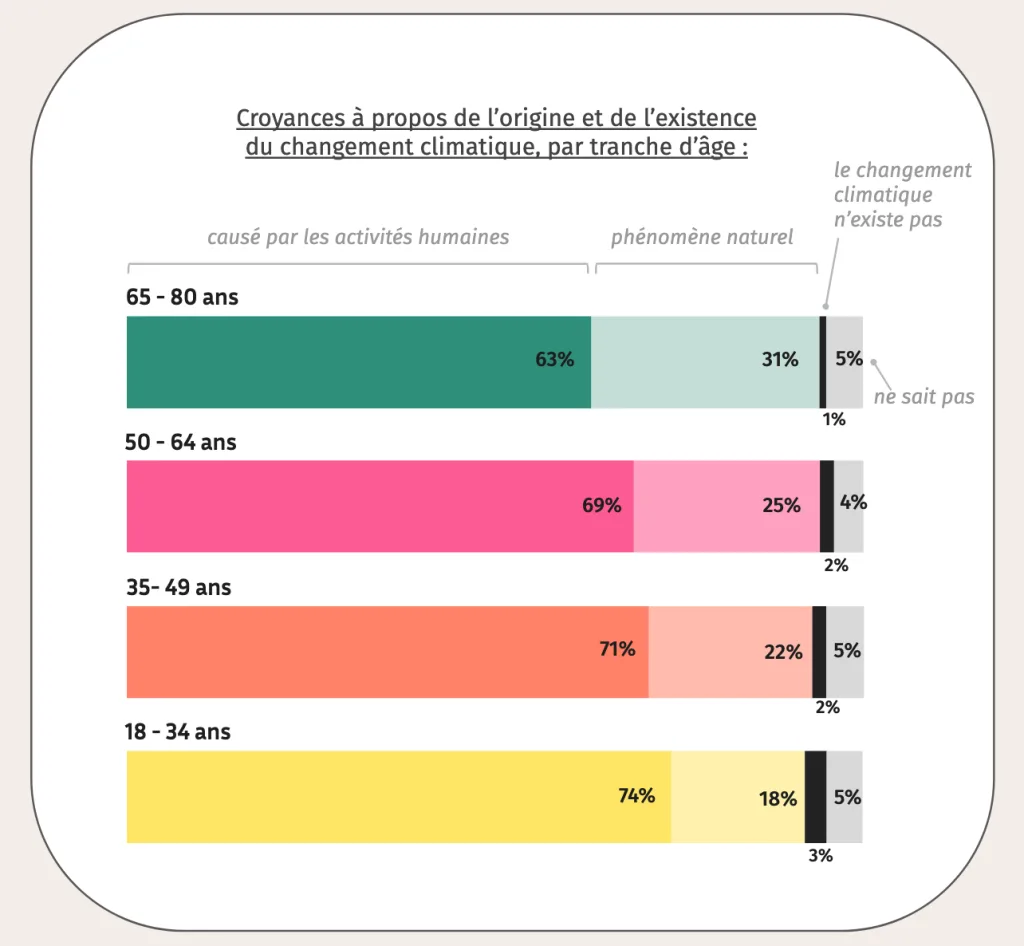 A noter que l’existence même du changement climatique n’est pas questionnée, c’est même la tranche d’âge qui compte le moins de dénialistes (1%).