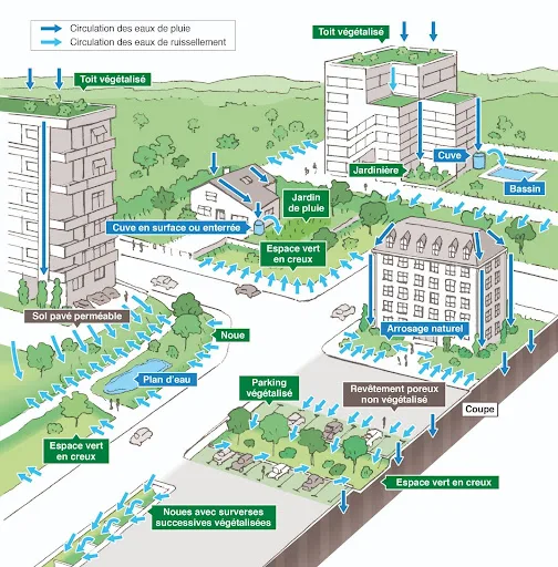 • les noues végétalisées et les jardins de pluie, véritables îlots de végétation aménagés en ville pour favoriser l’infiltration de l’eau dans le sol et contribuer à la protection contre les îlots de chaleur urbains ;