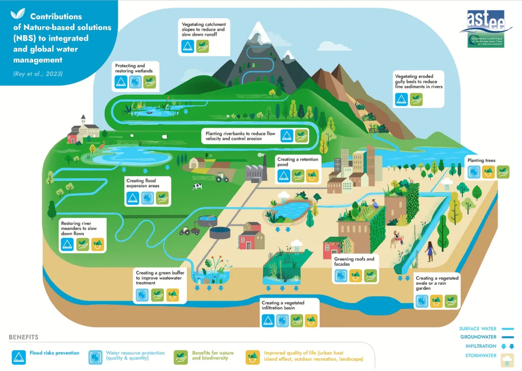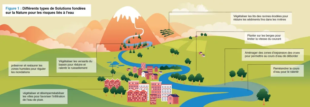 Dans le domaine de la gestion de l’eau, les Solutions fondées sur la Nature (SfN) correspondent à diverses actions :