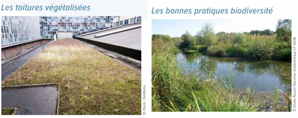 • les toitures végétalisées favorisent l’évapotranspiration des eaux pluviales ainsi que l’isolation thermique et acoustique des bâtiments.