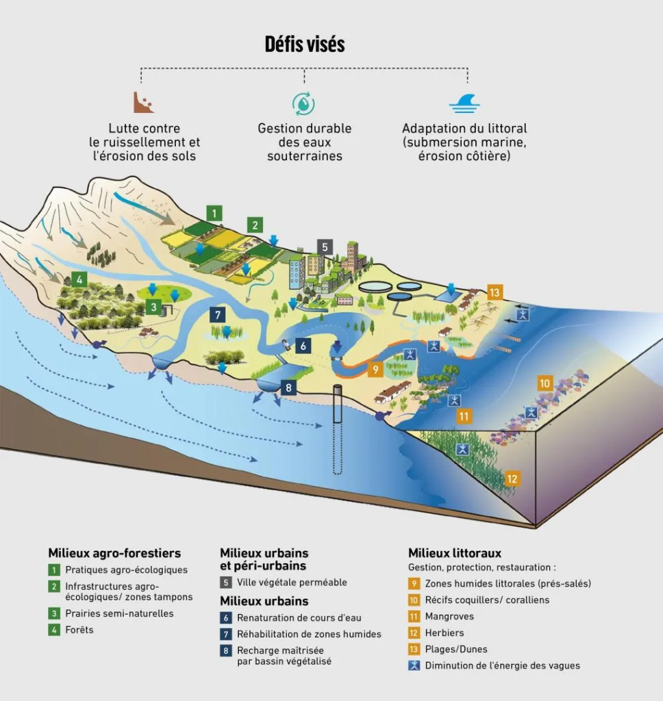 Certaines de ces actions étaient déjà proposées avant le développement du concept de SfN, ce dernier apportant une perspective systémique pour traiter conjointement l’adaptation au changement climatique, la restauration de la biodiversité et les questions d’équité. Par exemple, la restauration des zones humides permet de réduire les risques d’inondation ou de pénurie d’eau, de garantir l’approvisionnement en eau et de lutter contre le changement climatique.