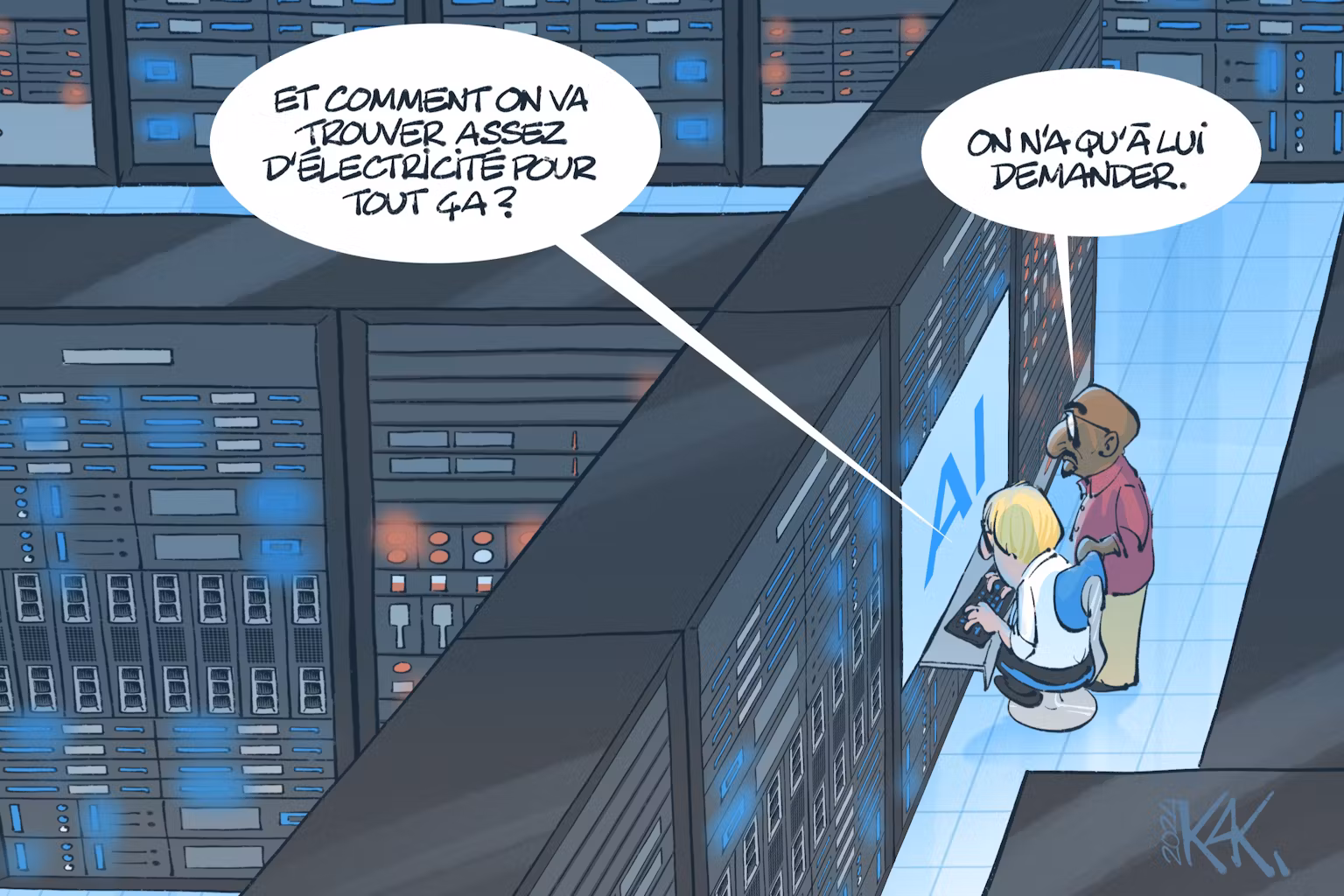 Si l’IA peut avoir des applications vertueuses pour l’environnement, cela vaut-il tout le carbone émis lors de son développement et de son usage ? Kak (France)/L’Opinion-Cartooning for Peace, Author provided (no reuse)